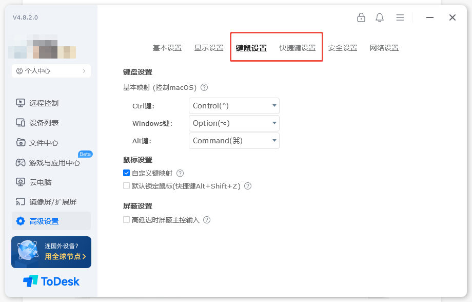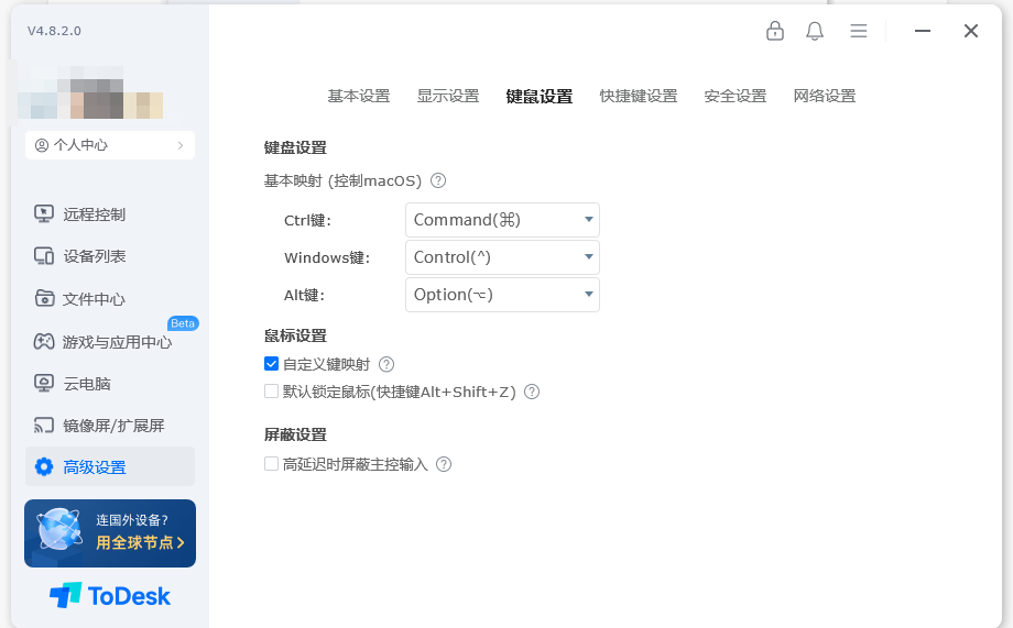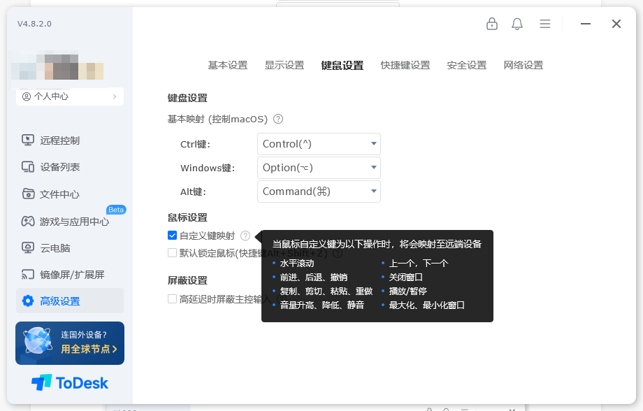 当主控和被控设备属于不同系统时,如macOS远程win系统,或win系统远程macOS,因为键盘的部分标志及常用快捷键不同,所以在此处提前设置好对应的映射键还是很有必要的。