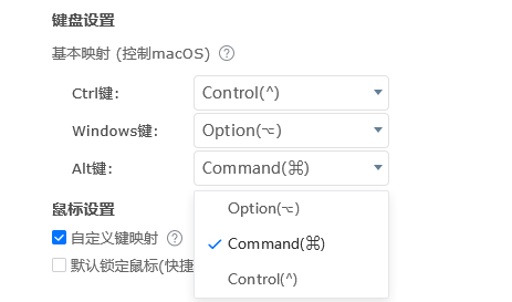 键盘设置的基础映射包含Ctrl键、Windows键以及Alt键这三个,而可选择的包括Control、Command和Option;使用者可以依照需求进行选择调整,这样即便是不同设备间的远程操作也能通顺无阻了。