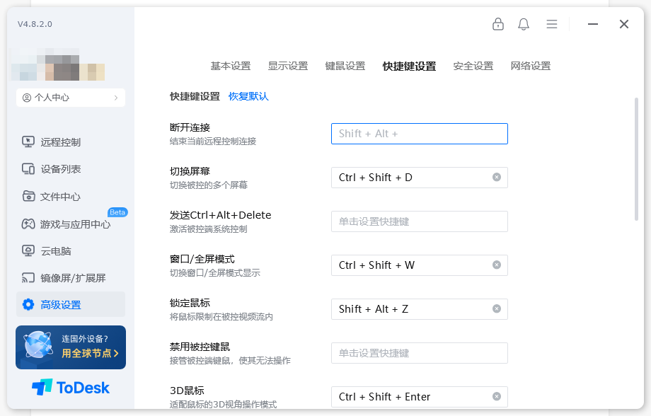 快捷键设置包含断开连接、切换屏幕、发送Ctrl+Alt+Delete、窗口/全屏模式、锁定鼠标、禁用被控键鼠、3D鼠标、聊天、文件传输、打开/关闭声音、显示传输状态、最小化、隐私屏、远程鼠标、关闭当前窗口、切换远控窗口等。