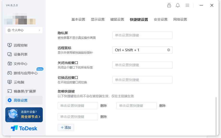 此外,还可以自定义添加安排忽略快捷键,设置好后,以下快捷键组合就不会在被控端生效,仅在主控端生效。