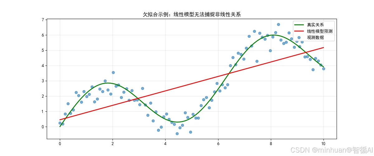 - 核心问题:使用过于简单的模型(线性回归)来解决复杂问题(非线性关系)