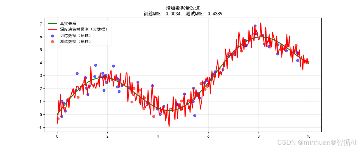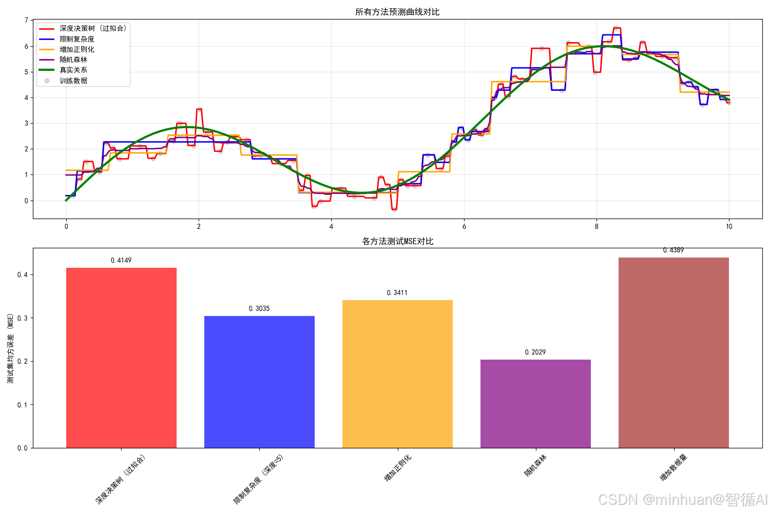 for name, (train_mse, test_mse) in sorted_methods:gap = test_mse - train_mseimprovement = ((test_mse_deep - test_mse) / test_mse_deep * 100) if name != '深度决策树 (过拟合)' else 0print(f"{name:<25} | {train_mse:.4f} | {test_mse:.4f} | {gap:.4f} | {improvement:>6.1f}%")# 绘制所有方法的预测曲线对比