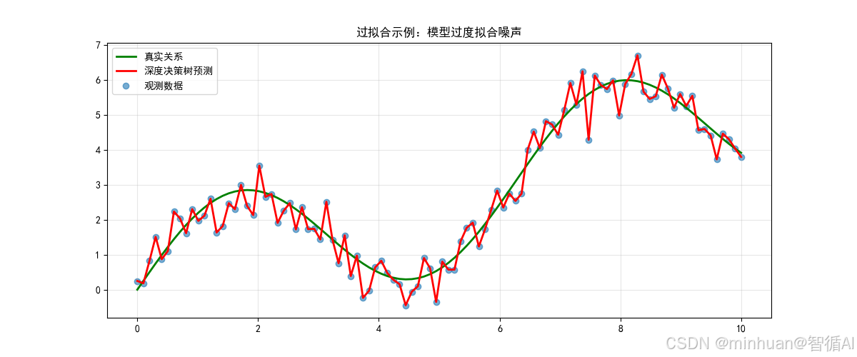 predictions = {'真实关系': (X_smooth, 2 * np.sin(X_smooth.ravel()) + 0.5 * X_smooth.ravel(), 'g-'),'深度决策树 (过拟合)': (X_smooth, y_smooth_deep, 'red'),'限制复杂度': (X_smooth, y_smooth_proper, 'blue'),'增加正则化': (X_smooth, y_smooth_reg, 'orange'),'随机森林': (X_smooth, y_smooth_forest, 'purple')