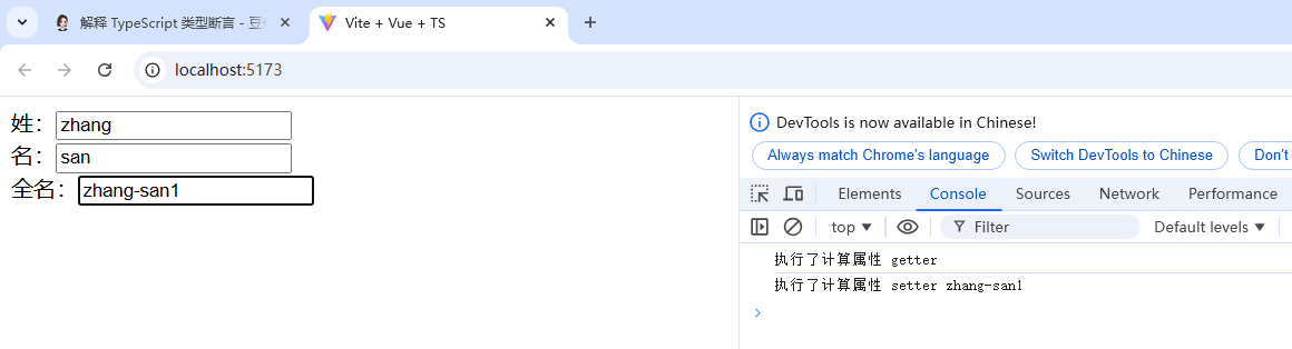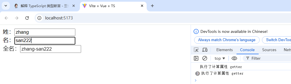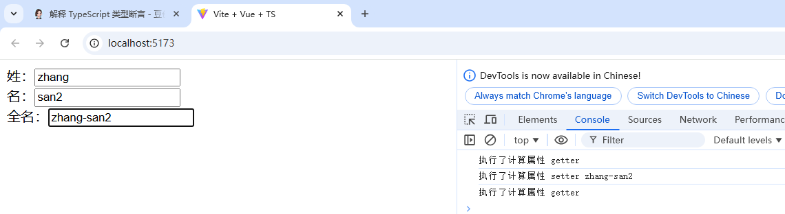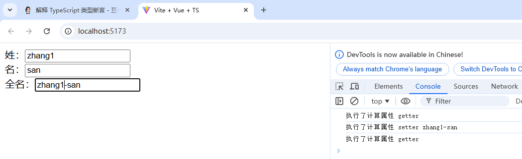 <template>姓:<input type="text" v-model="firstName"/><br/>名:<input type="text" v-model="lastName"/><br/>全名:<input type="text" v-model="fullName"/></template><script lang="ts" setup name="Perosn">import {computed, ref} from "vue";let firstName = ref('zhang')