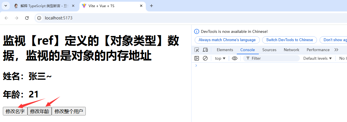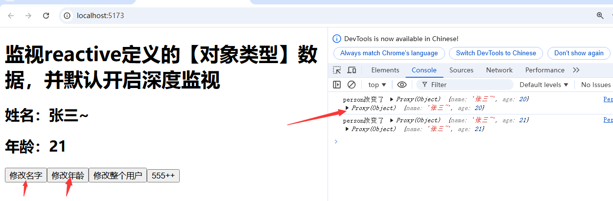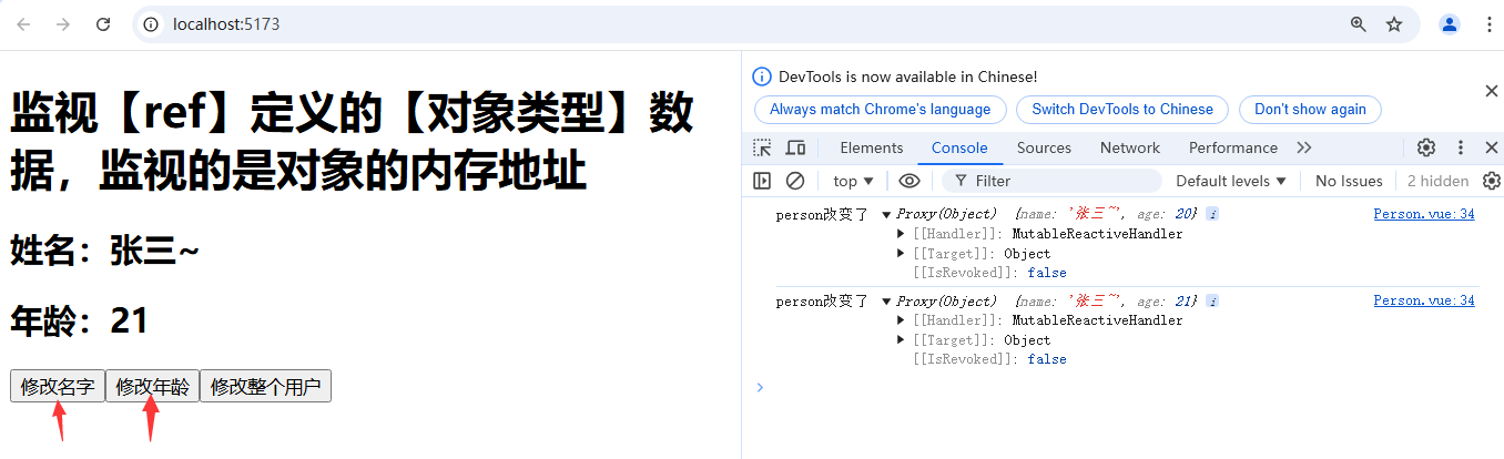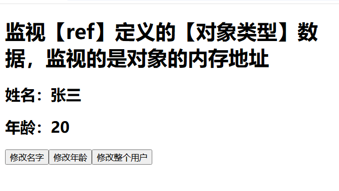 上述案例中,我们通过ref创建了原始对象类型数据Person,此对象中有name和age两个属性。之后创建了三个单击鼠标事件分别对此对象的两个属性及整个对象进行修改,然后开始监视此对象的变化。注意如果要监视此对象的name属性和age属性的变化,就必须开启深度监视,否则无法监视到属性的变化;