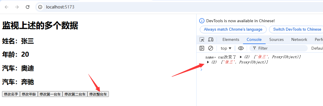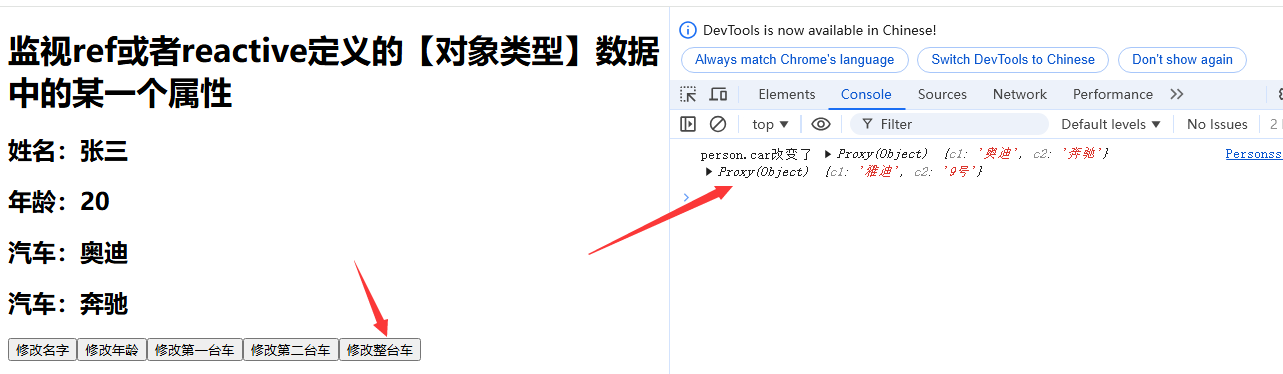 上述案例中,首先通过reative函数创建了一个原始对象类型数据person,在此对象中有基本类型属性name和age,还有一个对象类型属性Car,在对象类型属性Car中又有两个基本类型属性c1和c2.之后定义了一些单击鼠标事件,用于修改这些属性的值,之后在开启监视属性,监视这些属性的变化;