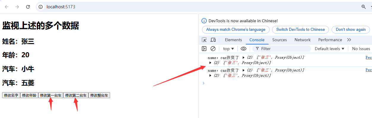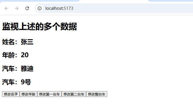 <template><h1>监视上述的多个数据</h1><h2>姓名:{{ person.name }}</h2><h2>年龄:{{ person.age }}</h2><h2>汽车:{{ person.car.c1 }}</h2><h2>汽车:{{ person.car.c2 }}</h2><button @click="changeName">修改名字</button><button @click="changeAge">修改年龄</button><button @click="changeC1">修改第一台车</button><button @click="changeC2">修改第二台车</button><button @click="changeCar">修改整台车</button></template><script lang="ts" setup name="Person">