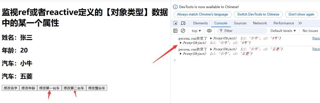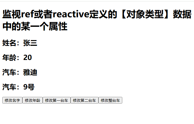 <template><h1>监视ref或者reactive定义的【对象类型】数据中的某一个属性</h1><h2>姓名:{{ person.name }}</h2><h2>年龄:{{ person.age }}</h2><h2>汽车:{{ person.car.c1 }}</h2><h2>汽车:{{ person.car.c2 }}</h2><button @click="changeName">修改名字</button><button @click="changeAge">修改年龄</button><button @click="changeC1">修改第一台车</button><button @click="changeC2">修改第二台车</button><button @click="changeCar">修改整台车</button></template><script lang="ts" setup name="Person">