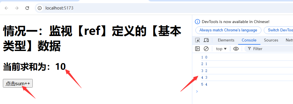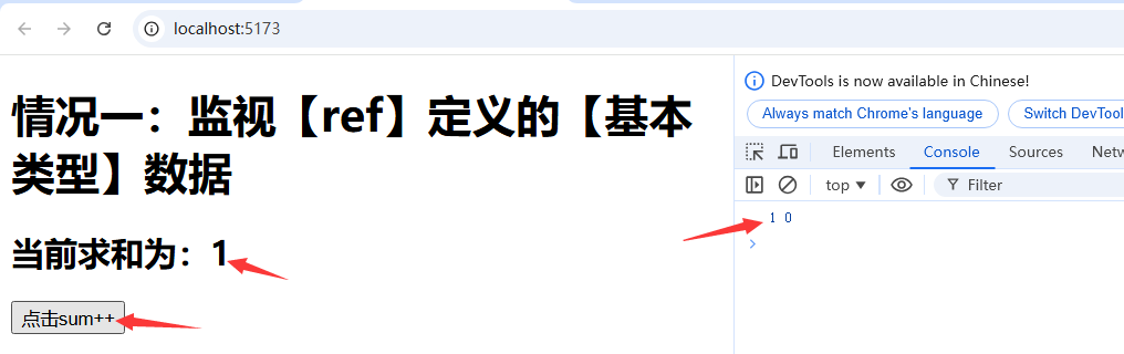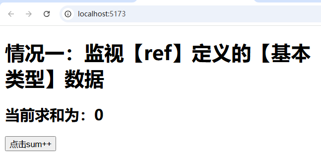 <template><h1>情况一:监视【ref】定义的【基本类型】数据</h1><h2>当前求和为:{{ sum }}</h2><button @click="changeSum">点击sum++</button>