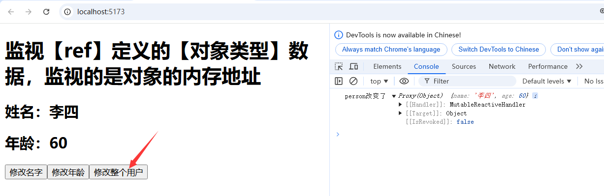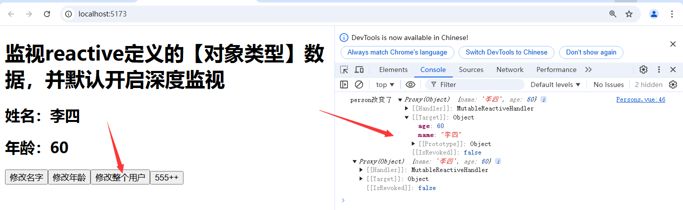 const changePerson = () => {//reactive >> proxy >> person ={name: '张三', age: 20}// person = {name: '李四', age: 60};Object.assign(person, {name: '李四', age: 60})