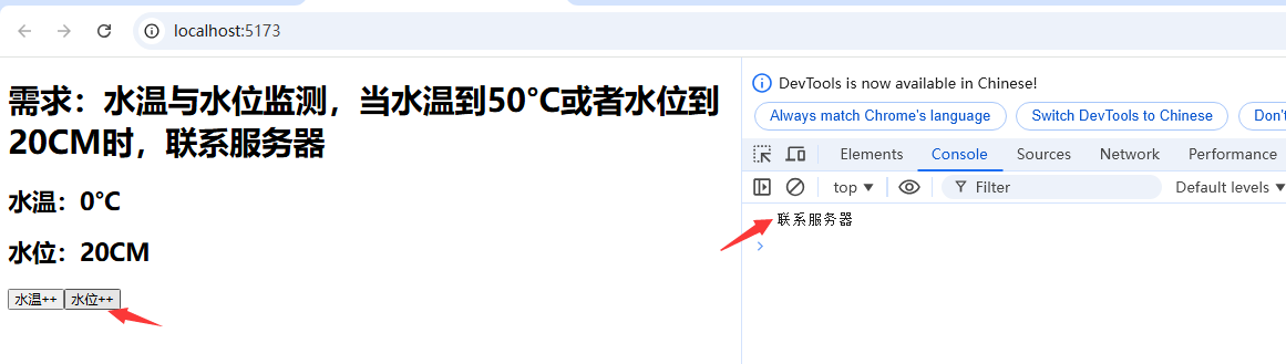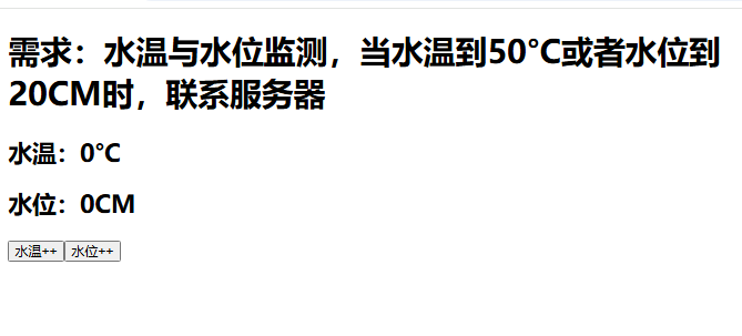 <template><h1>需求:水温与水位监测,当水温到50°C或者水位到20CM时,联系服务器</h1><h2>水温:{{ temp }}°C</h2><h2>水位:{{ height }}CM</h2><button @click="changeTemp">水温++</button><button @click="changeHeight">水位++</button>