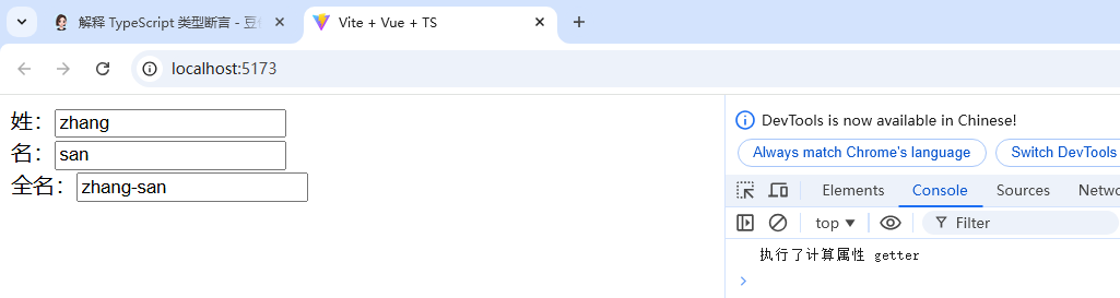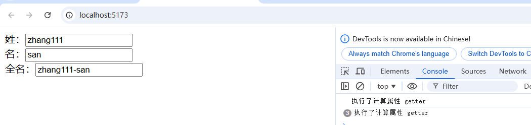 let fullName = computed({get() {console.log("执行了计算属性 getter")return firstName.value + "-" + lastName.value;},set(value) {console.log("执行了计算属性 setter", value);let arr = value.split("-");firstName.value = arr[0];lastName.value = arr[1];}