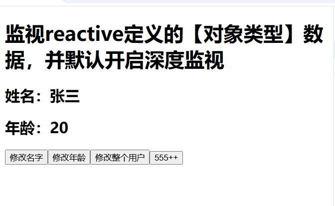 <template><h1>监视reactive定义的【对象类型】数据,并默认开启深度监视</h1><h2>姓名:{{ person.name }}</h2><h2>年龄:{{ person.age }}</h2><button @click="changeName">修改名字</button><button @click="changeAge">修改年龄</button><button @click="changePerson">修改整个用户</button><button @click="obj.a.b.c.d++">{{ obj.a.b.c.d }}++</button></template><script lang="ts" setup name="Persons">