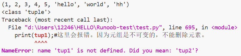 print(tup1);#这里会报错。因为元组是不可变的,不能删除元素。