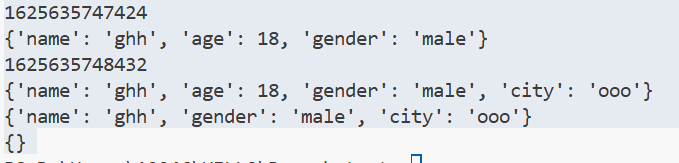 print(id(dict1["name"]));dict1["city"]="ooo";#添加,加在字典尾部