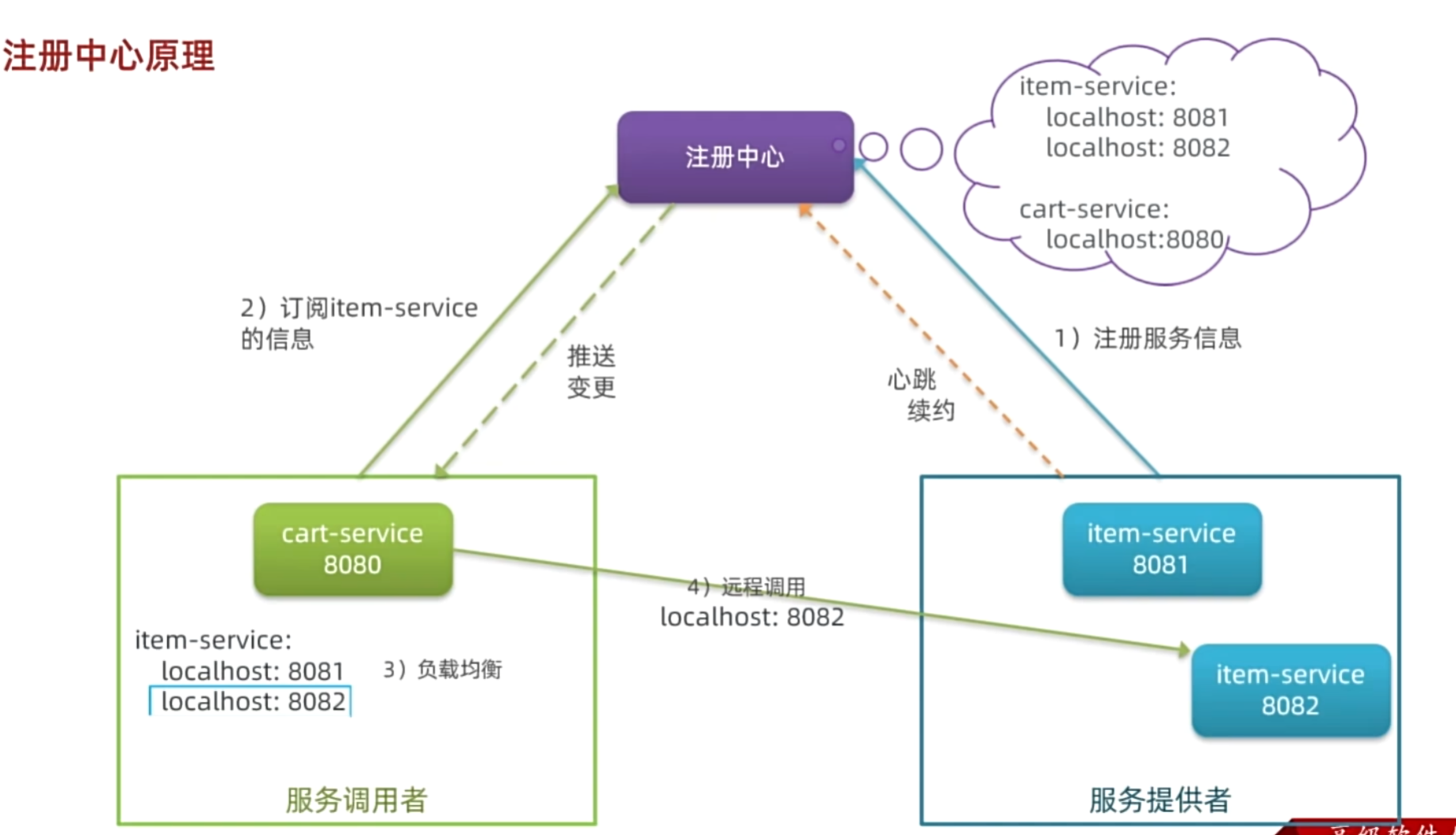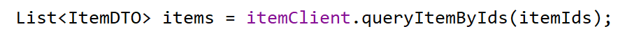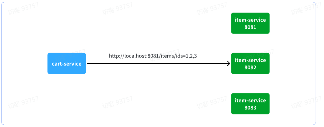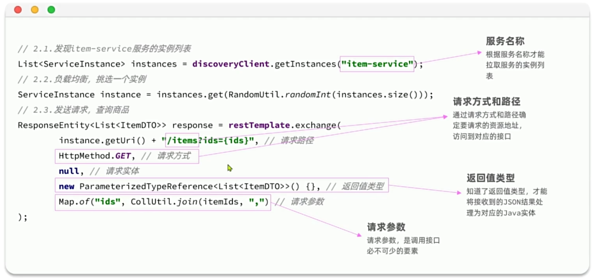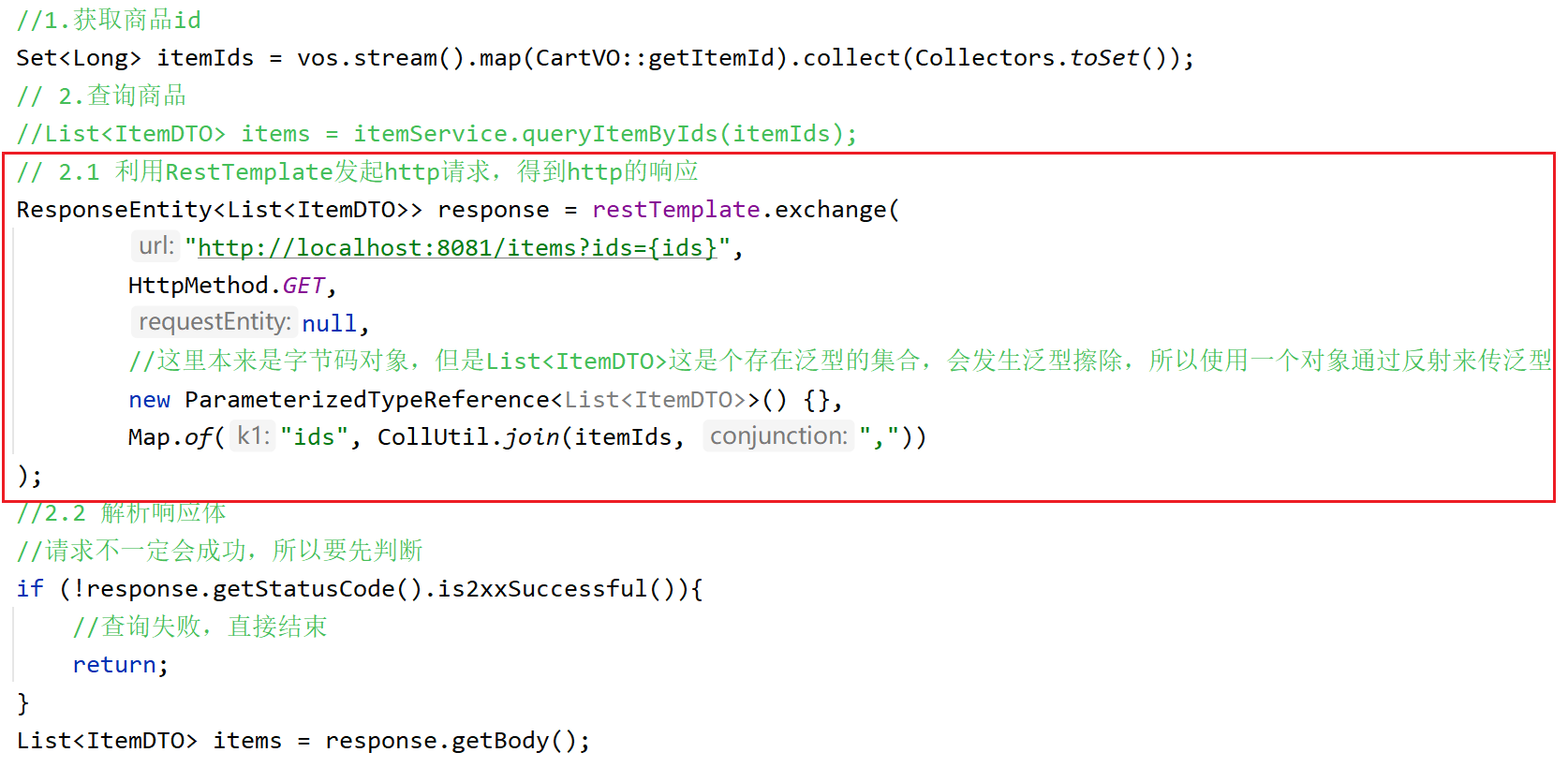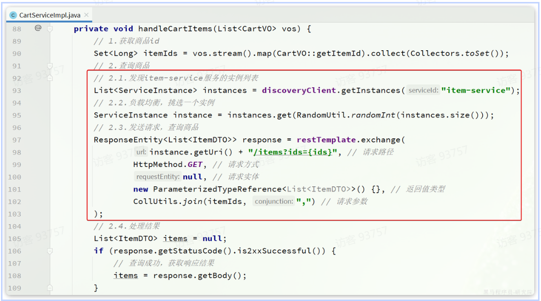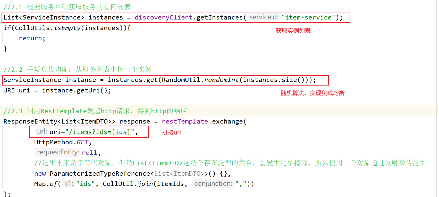 private final DiscoveryClient discoveryClient;private void handleCartItems(List<CartVO> vos) {//1.获取商品idSet<Long> itemIds = vos.stream().map(CartVO::getItemId).collect(Collectors.toSet());// 2.查询商品//2.1 根据服务名称获取服务的实例列表List<ServiceInstance> instances = discoveryClient.getInstances("item-service");if(CollUtils.isEmpty(instances)){return;}//2.2 手写负载均衡,从服务列表中挑一个实例ServiceInstance instance = instances.get(RandomUtil.randomInt(instances.size()));URI uri = instance.getUri();//2.3 利用RestTemplate发起http请求,得到http的响应ResponseEntity<List<ItemDTO>> response = restTemplate.exchange(uri+"/items?ids={ids}",HttpMethod.GET,null,//这里本来是字节码对象,但是List<ItemDTO>这是个存在泛型的集合,会发生泛型擦除,所以使用一个对象通过反射来传泛型new ParameterizedTypeReference<List<ItemDTO>>() {},Map.of("ids", CollUtil.join(itemIds, ",")));//2.2 解析响应体//请求不一定会成功,所以要先判断if (!response.getStatusCode().is2xxSuccessful()){//查询失败,直接结束return;}List<ItemDTO> items = response.getBody();if (CollUtils.isEmpty(items)) {return;}// 3.转为 id 到 item的mapMap<Long, ItemDTO> itemMap = items.stream().collect(Collectors.toMap(ItemDTO::getId, Function.identity()));// 4.写入vofor (CartVO v : vos) {ItemDTO item = itemMap.get(v.getItemId());if (item == null) {continue;}v.setNewPrice(item.getPrice());v.setStatus(item.getStatus());v.setStock(item.getStock());}}