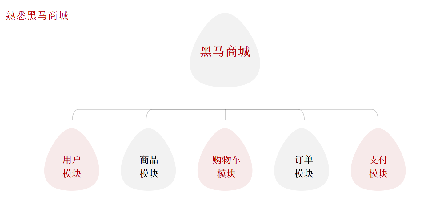 例如,黑马商城项目,我们就可以把商品、用户、购物车、交易等模块拆分,交给不同的团队去开发,并独立部署: