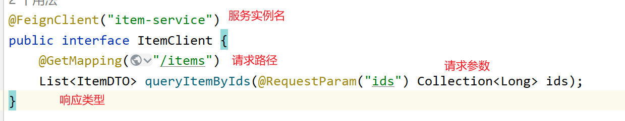 3.编写FeignClient接口类,类名上加@FeignClient("服务实例名");接口方法定义请求方式、请求路径、请求参数、响应参数类型。