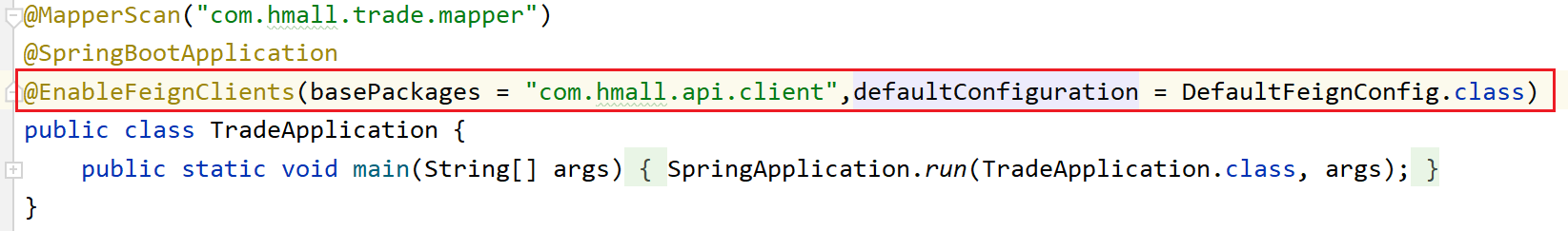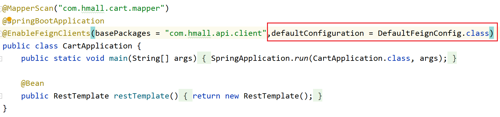 3.要想全局配置,让所有FeignClient都按照这个日志配置,则需要在@EnableFeignClients注解中声明: