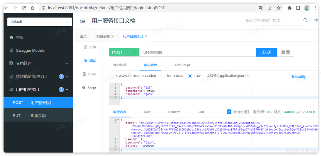 启动UserApplication,访问http://localhost:8084/doc.html#/default/用户相关接口/loginUsingPOST,测试登录接口: