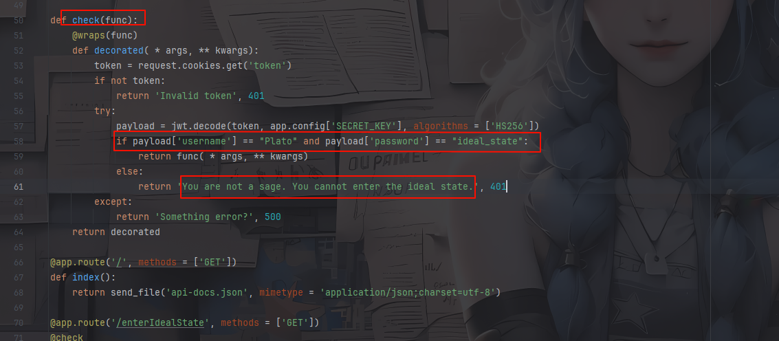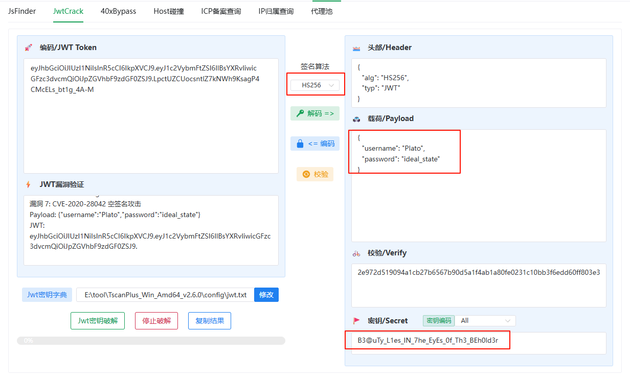 发现在一个check函数中,并且是通过if判断,如果用户名不是Plato并且密码不是ideal_state就会输出上面的内容,也就是我们需要构造token,账号密码分别对应Plato、ideal_state