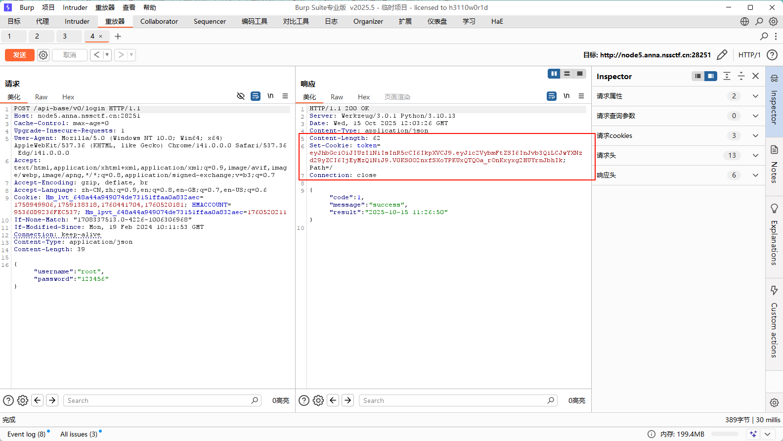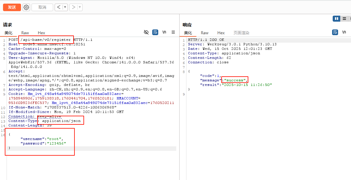 然后POST请求体写入用户名和密码,需要用JSON格式,并且类型也需要改成JSON