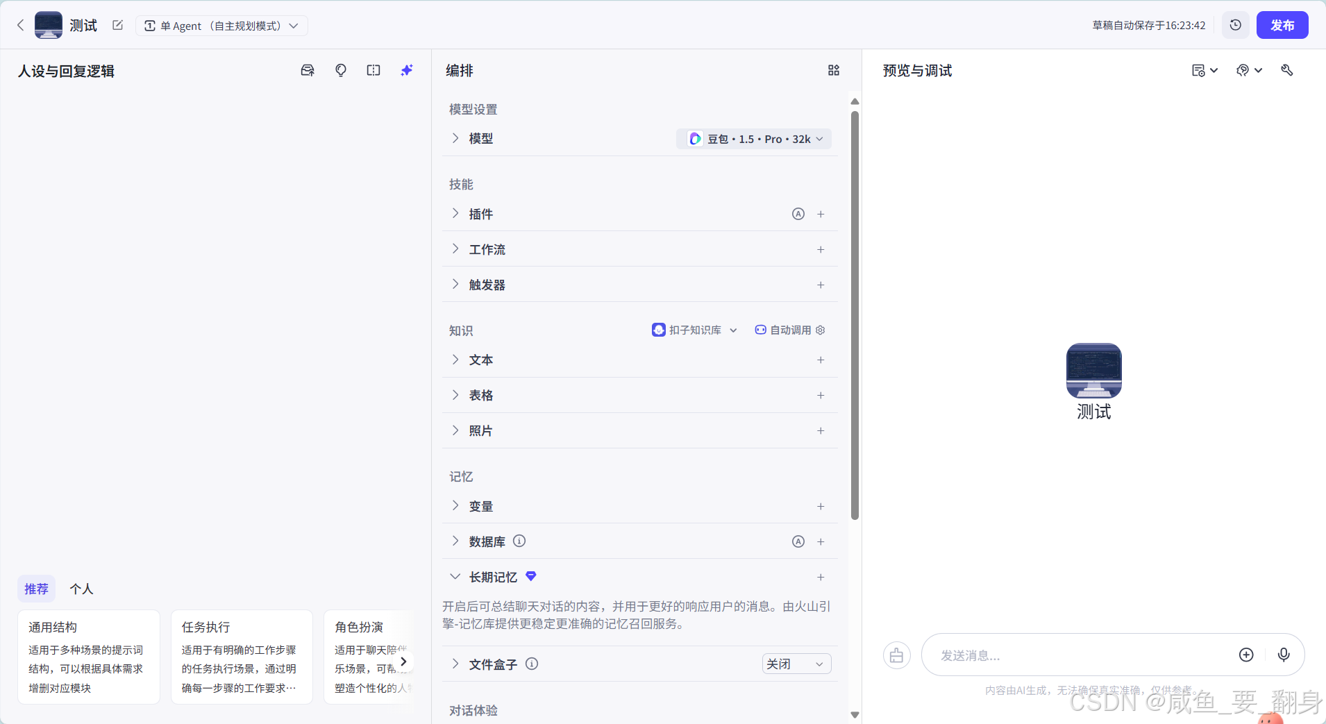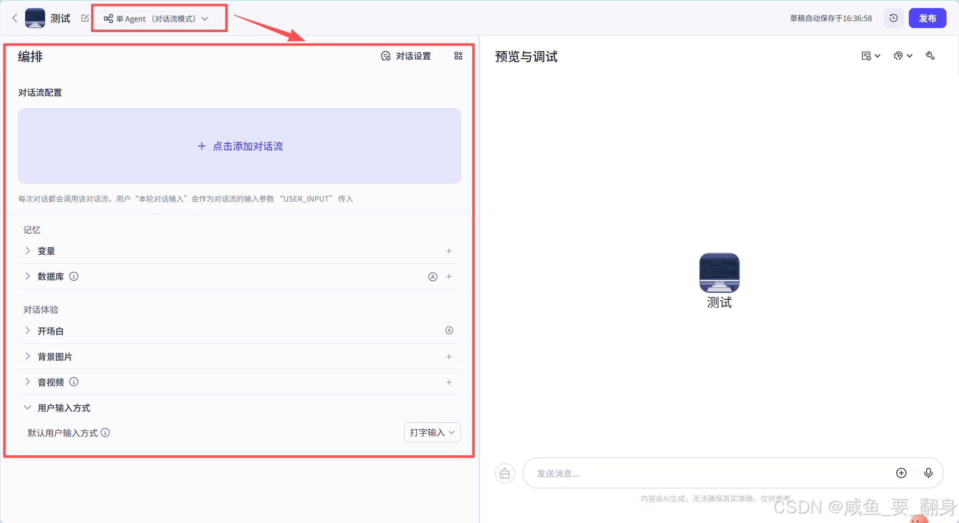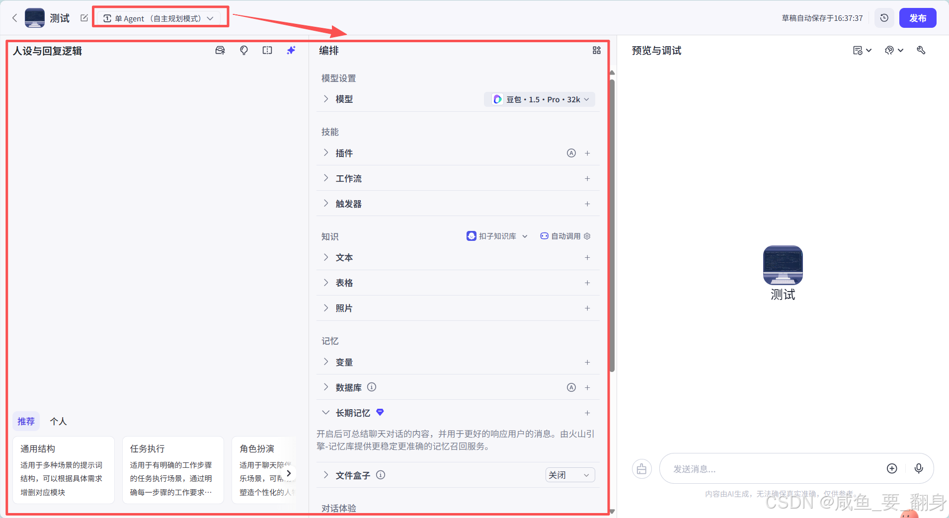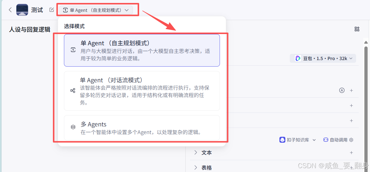 在后续的学习过程中,由于我们会创建多个智能体,且每个智能体的案例场景相对单一,所以我们的智能体都选择单 Agent(自主规划模式)。