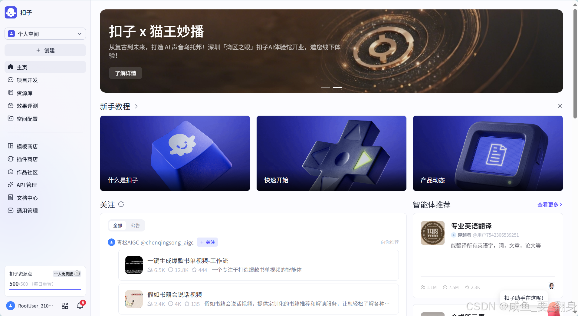注册与认证:访问主页 - 扣子,使用抖音账号或手机号注册账号,并完成实名认证(具体操作可参考上一篇博客的环境准备内容)。