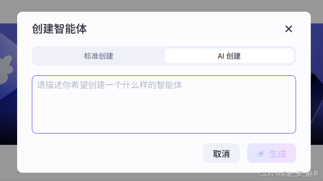 AI 创建:输入需求描述(例如“帮我创建一个能生成旅游攻略的智能体”),系统将自动生成智能体的基础配置。这种方式更为便捷,适合对智能体功能有初步设想但希望快速获得初步方案的场景。