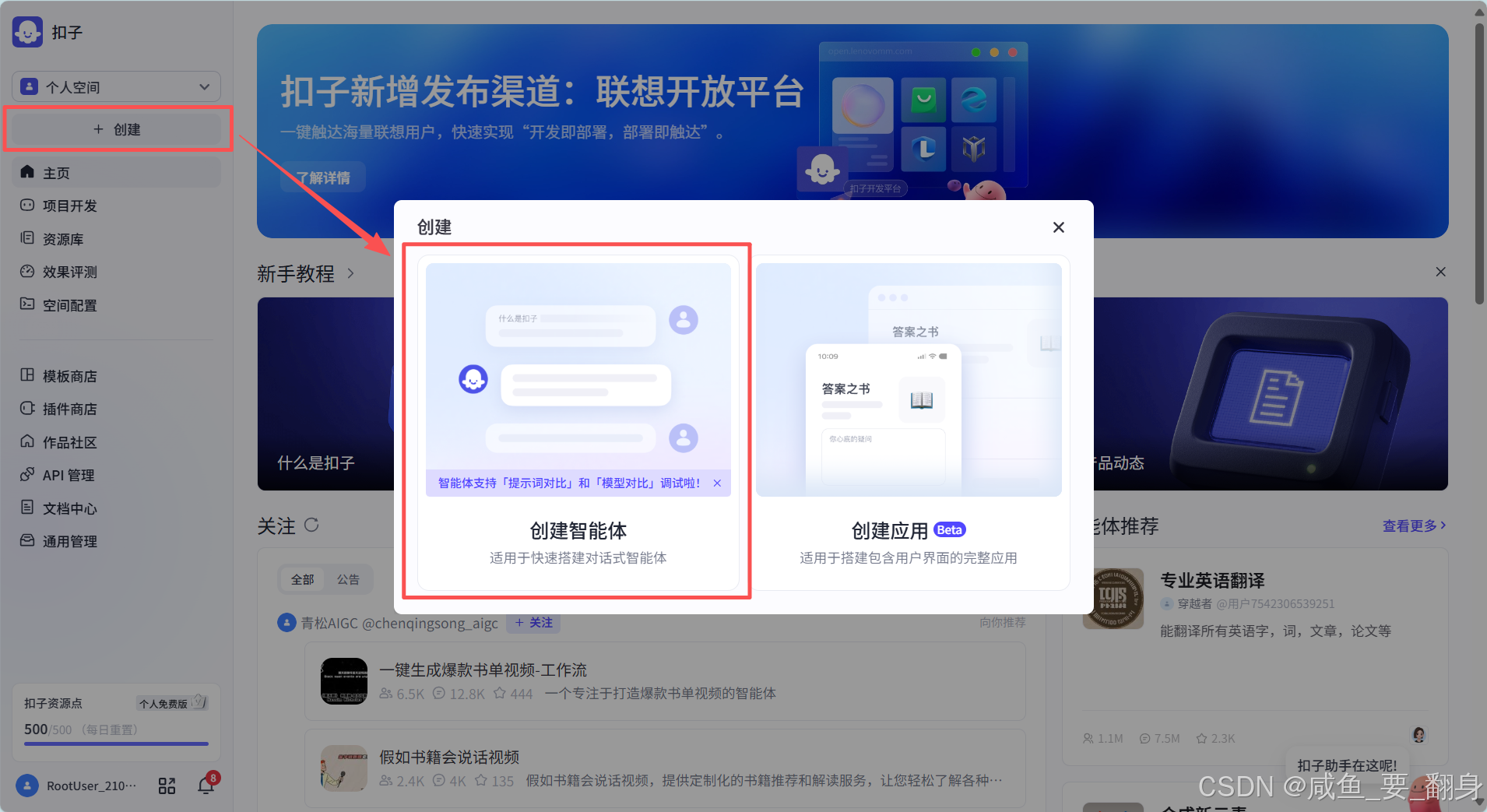 创建智能体:进入“工作空间”→“项目开发”→点击左上角“创建智能体”,此时有两种创建方式可供选择: