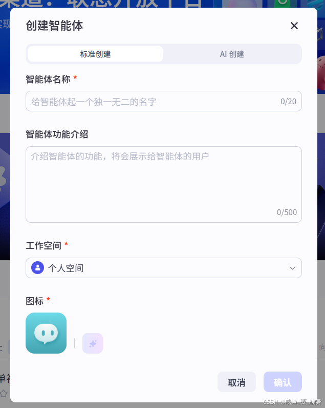 标准创建:手动填写智能体的名称(例如“电商客服助手”)、功能描述(例如“7×24 小时解答产品咨询,提供价格对比和库存查询”),并上传或生成智能体的图标。通过这种方式,我们可以精确地定义智能体的基本属性和功能定位。