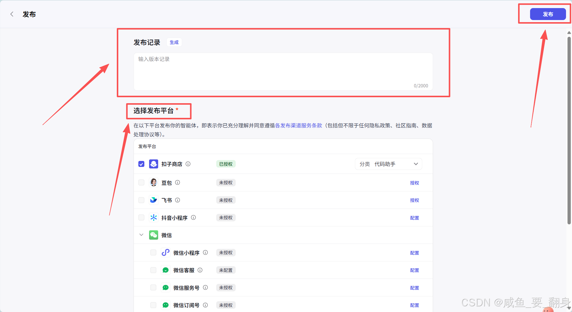 具体步骤如下:首先,点击界面右上角的“发布”按钮,此时会弹出选择目标平台的窗口。在窗口中,开发者可以根据实际需求选择合适的发布平台,如微信公众号、抖音、飞书等。选择好目标平台后,需要填写发布记录。