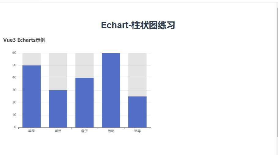 const initChart = () => {const dom = document.getElementById(chartId.value);chartInstance.value = echarts.init(dom);const option = {//标题信息title: {text: 'Vue3 Echarts示例'},//x轴信息xAxis: {data: ['苹果', '香蕉', '橙子', '葡萄', '草莓']},//y轴信息yAxis: {},//系列数据series: [{name: '销量',type: 'bar',data: [50, 30, 40, 60, 25],showBackground: true,backgroundStyle: {color: 'rgba(220, 220, 220, 0.8)'}}]};chartInstance.value.setOption(option);