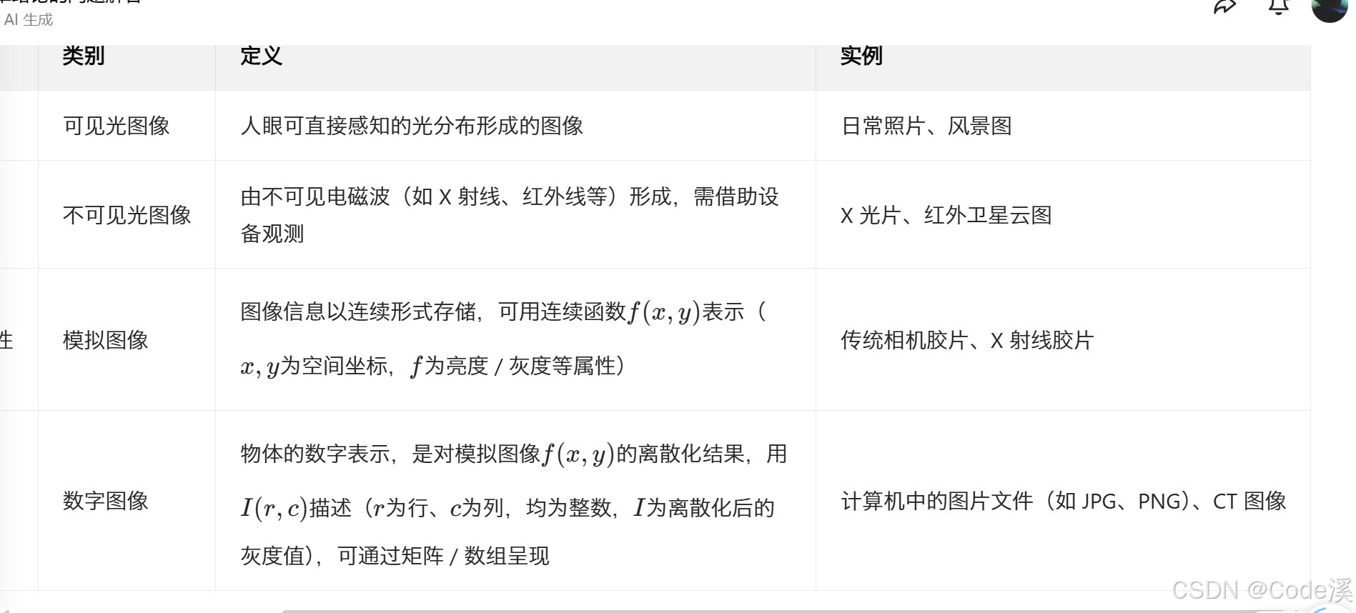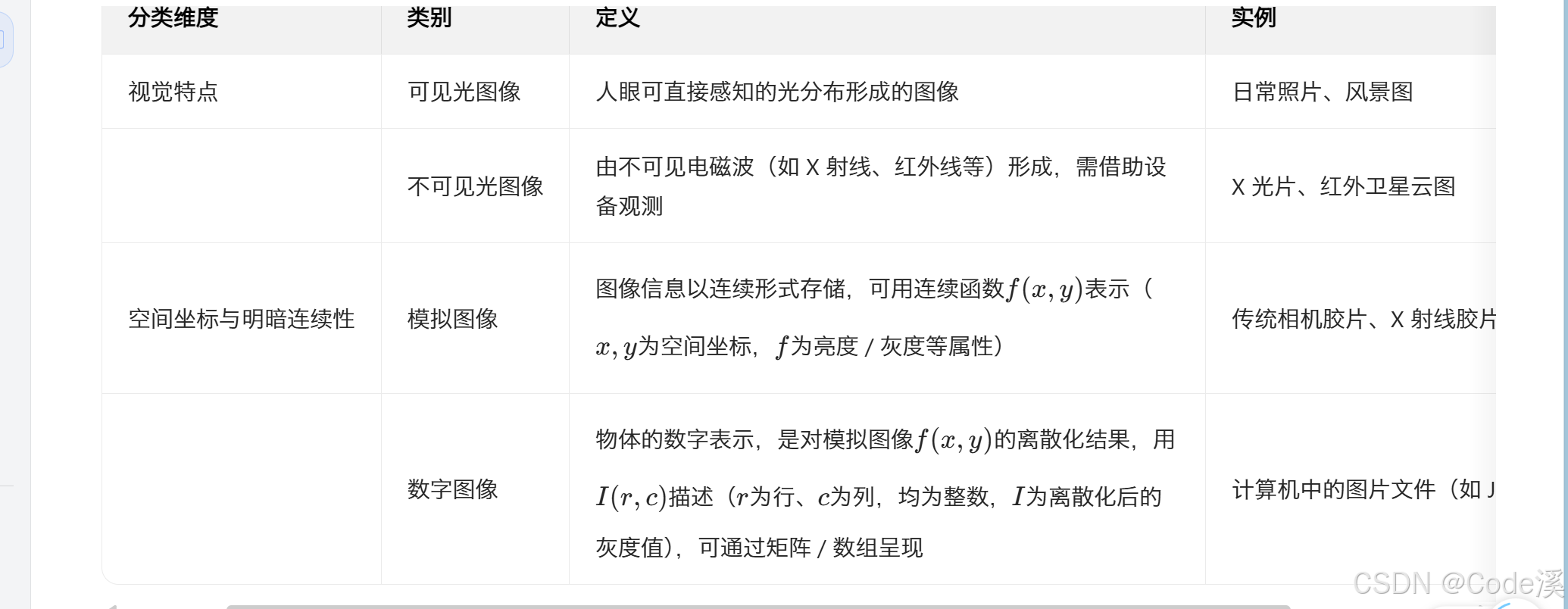 空间坐标与明暗连续性 | 模拟图像 | 图像信息以连续形式存储,可用连续函数\(f(x,y)\)表示(\(x,y\)为空间坐标,f为亮度 / 灰度等属性) | 传统相机胶片、X 射线胶片 |