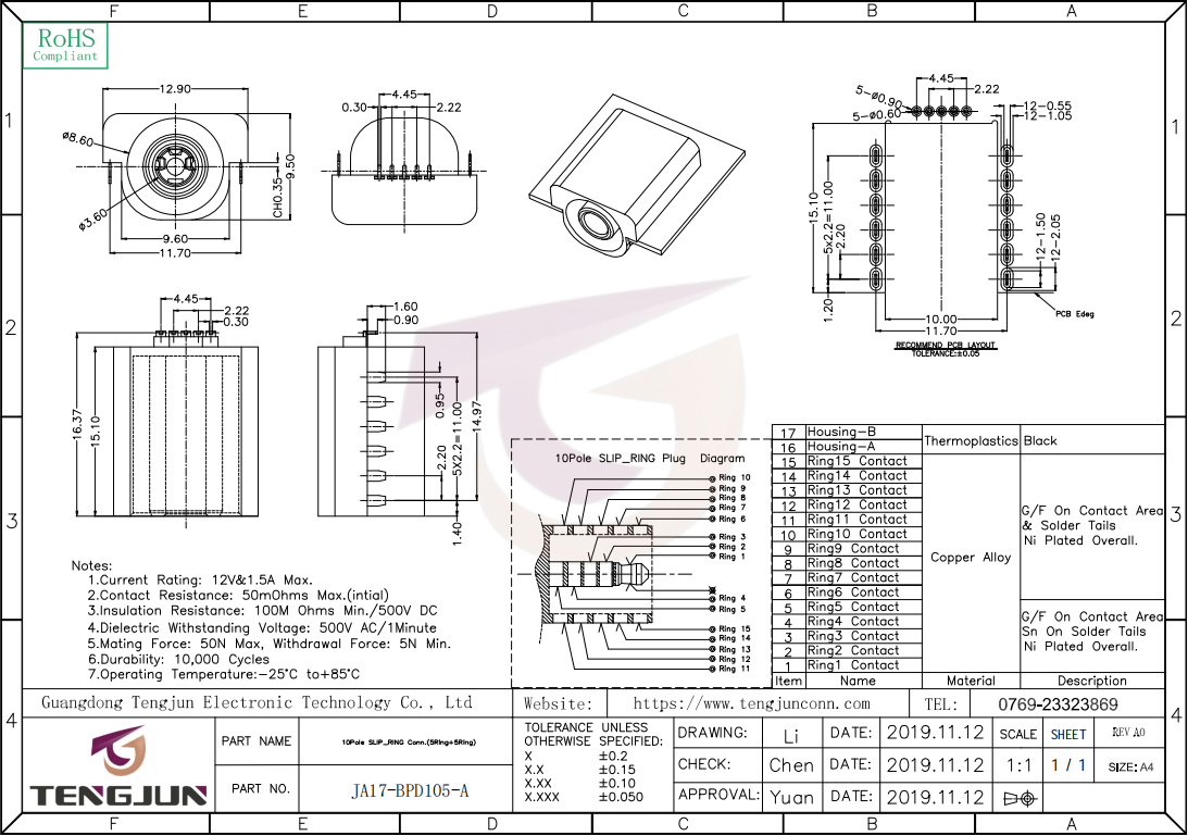 TENGJUN JA017-BPD105-A-SLIP-RING绝非一个普通的耳机插座。它通过10极(5+5)的高密度信号集成能力、革命性的滑动环接触技术以及宽广的工作温度范围,共同构建了一个面向高端专业应用的坚固、可靠且功能丰富的连接解决方案。在信号即是生命的安防与医疗领域,选择这样一个经过精心设计和制造的组件,无疑是为整个系统的稳定运行上了一道至关重要的保险。