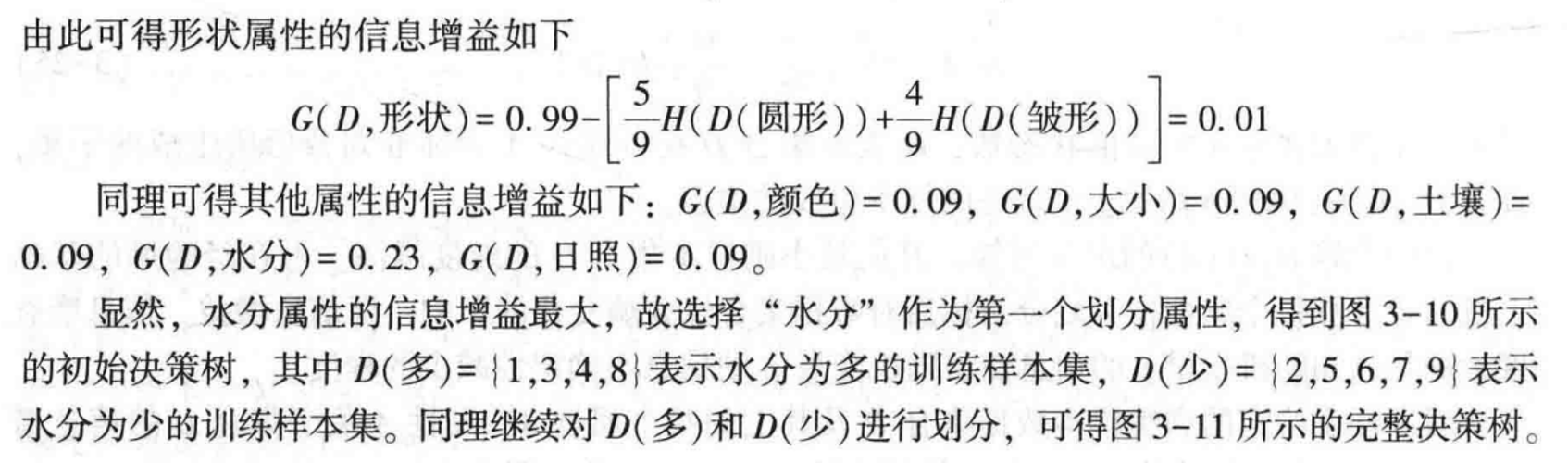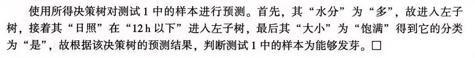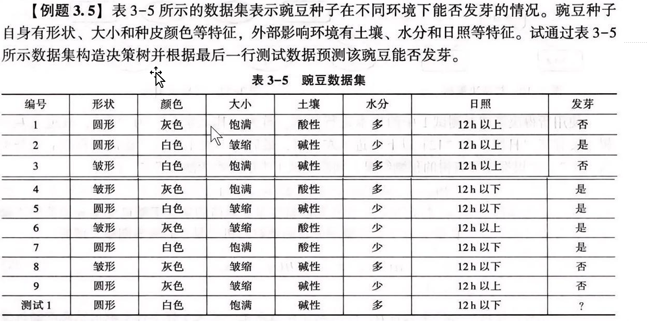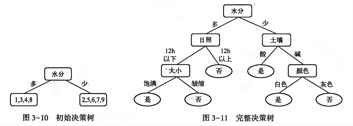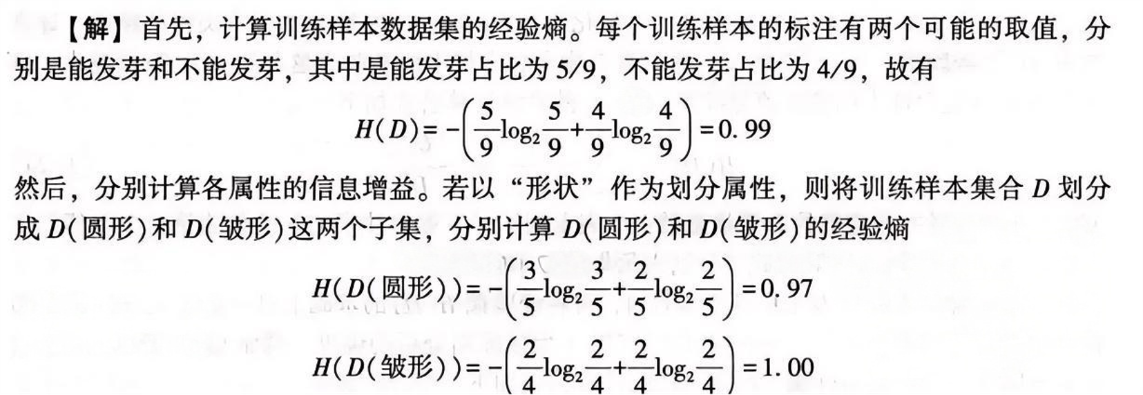 if __name__ == "__main__":# 1. 构建数据集(5个"是",4个"否")data = {"形状": ["圆形", "圆形", "皱形", "皱形", "圆形", "皱形", "圆形", "皱形", "圆形"],"颜色": ["灰色", "白色", "灰色", "白色", "白色", "白色", "白色", "灰色", "灰色"],"大小": ["皱缩", "饱满", "皱缩", "饱满", "饱满", "饱满", "饱满", "皱缩", "皱缩"],"土壤": ["酸性", "酸性", "碱性", "酸性", "酸性", "碱性", "酸性", "碱性", "碱性"],"水分": ["多", "少", "多", "多", "少", "少", "少", "多", "多"],"日照": ["12h以上", "12h以上", "12h以上", "12h以下", "12h以下", "12h以上", "12h以下", "12h以下", "12h以上"],"发芽": ["否", "是", "否", "是", "是", "是", "是", "否", "否"]}df = pd.DataFrame(data)X = df.drop("发芽", axis=1) # 特征y = df["发芽"] # 标签# 2. 训练决策树print("=== 训练ID3决策树 ===")id3 = ID3DecisionTree()id3.fit(X, y)# 3. 打印决策树结构(文本形式)print("\n=== 决策树结构(文本形式) ===")id3.print_tree()# 4. 预测测试数据test_data = pd.DataFrame({"形状": ["圆形"], "颜色": ["白色"], "大小": ["饱满"],"土壤": ["碱性"], "水分": ["多"], "日照": ["12h以下"]})print("\n=== 测试数据预测 ===")print("测试数据特征:")print(test_data.T) # 转置显示更清晰print(f"预测结果:{id3.predict(test_data).iloc[0]}")