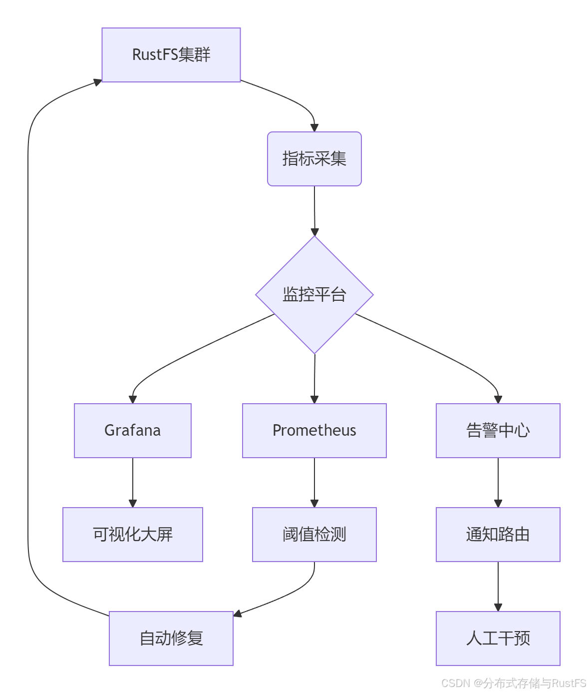 一个成熟的RustFS运维体系应该包含监控采集、分析告警、故障自愈三个核心层次,形成完整的运维闭环。