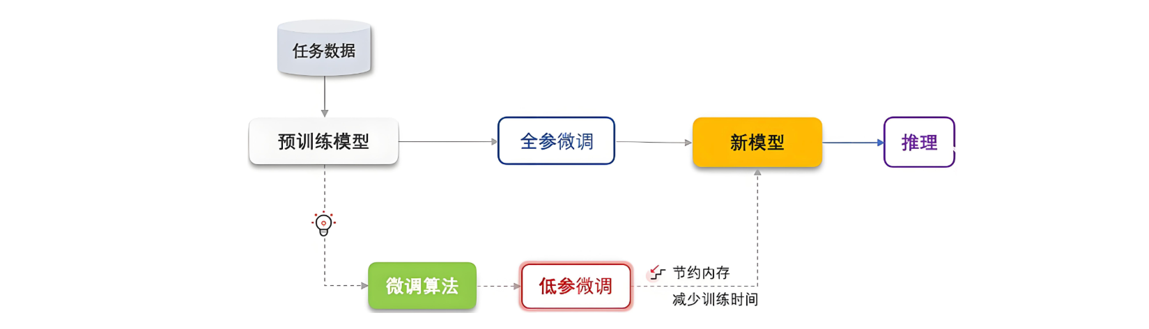 LoRA | 0.1%~1% | 低 | 低(切换简单) | 数据稀缺、多任务适应 |