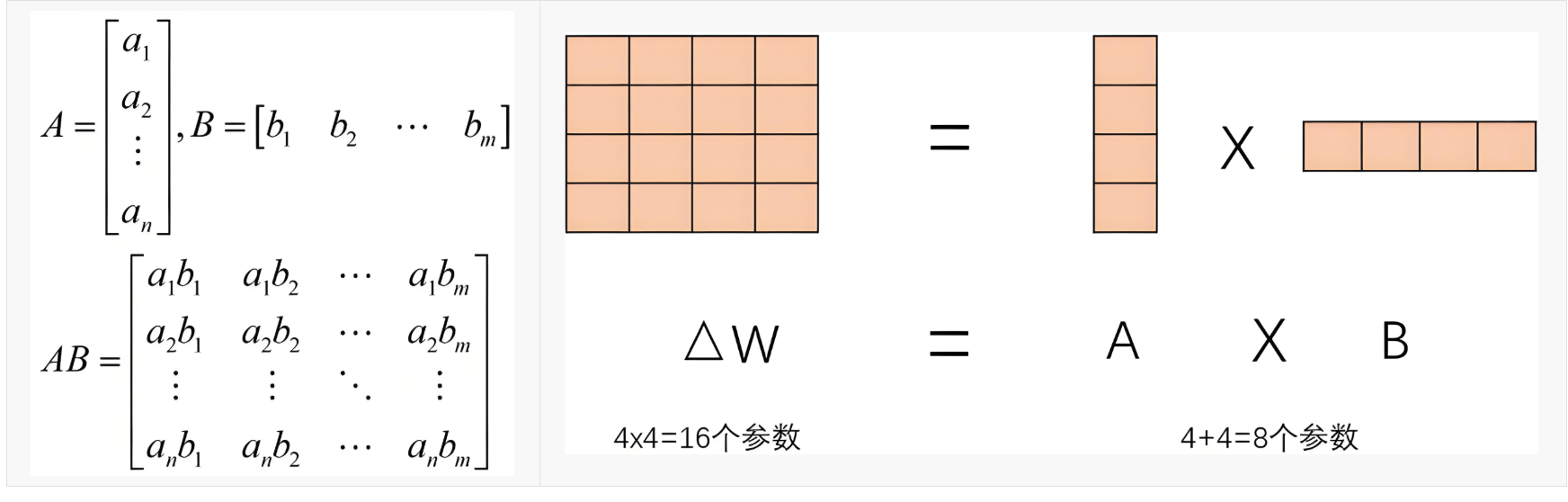 LoRA的核心思想是将这个权重矩阵分解为两个较小的矩阵