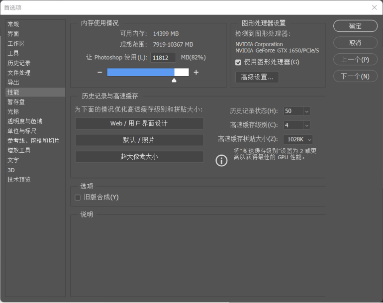 在性能这一栏,使用内存最好设置在80%,设置在80%目的是在PS运行效率与系统整体稳定性之间寻求最佳平衡,避免单一软件过度占用资源导致全局卡顿或崩溃。
