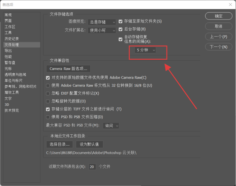 自动存储恢复间隔,这里时间建议设置在5~10分钟之间。设置在5~10之间可以确保在意外情况发生时,能够最大程度地恢复,如果时间设置过短,可能会导致软件频繁保存,占用系统资源,影响工作效率,并且占用暂存空间,这里设置为分钟。如下所示: