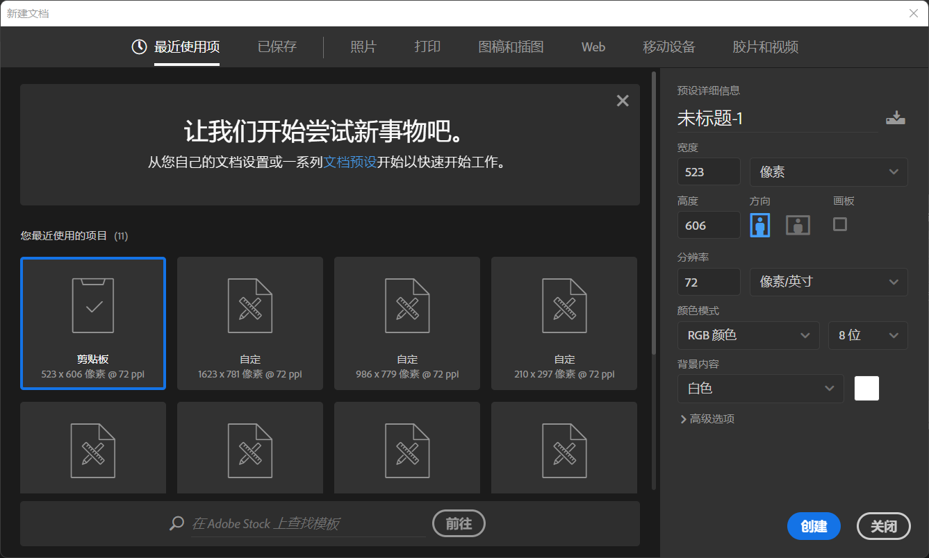 打开Photoshop软件,点击新建,进入到下面这个界面: