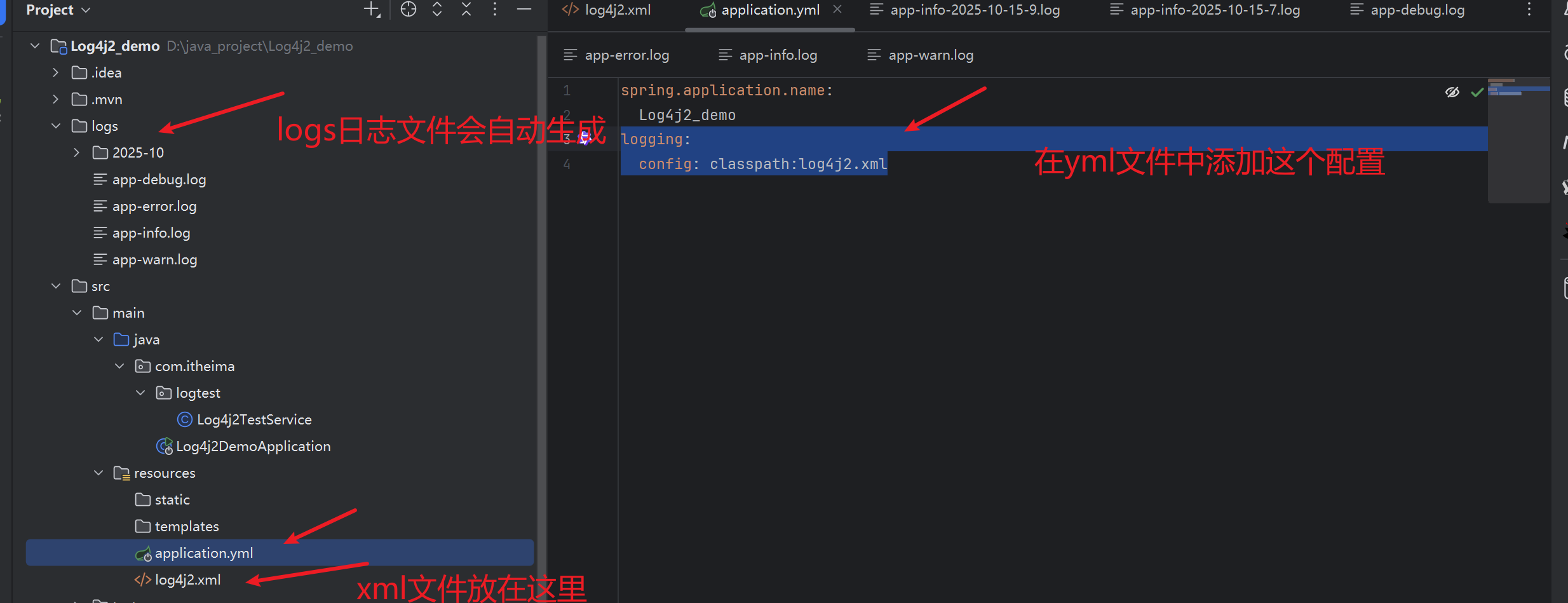 第三步,将xml文件放到resource目录下,下次启动项目,日志会自动被记录到logs目录(这个目录会在项目启动时自动生成)并分离清洗
