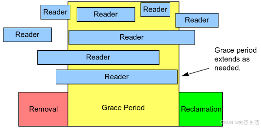 - Grace Period(宽限期):黄色块是 RCU 的 “宽限期”,它的持续时间由最晚完成的读者决定(图中箭头标注 “Grace period extends as needed”,即宽限期会根据读者的结束时间动态延长)。在宽限期内,写者会等待所有访问旧数据的读者都退出读临界区。