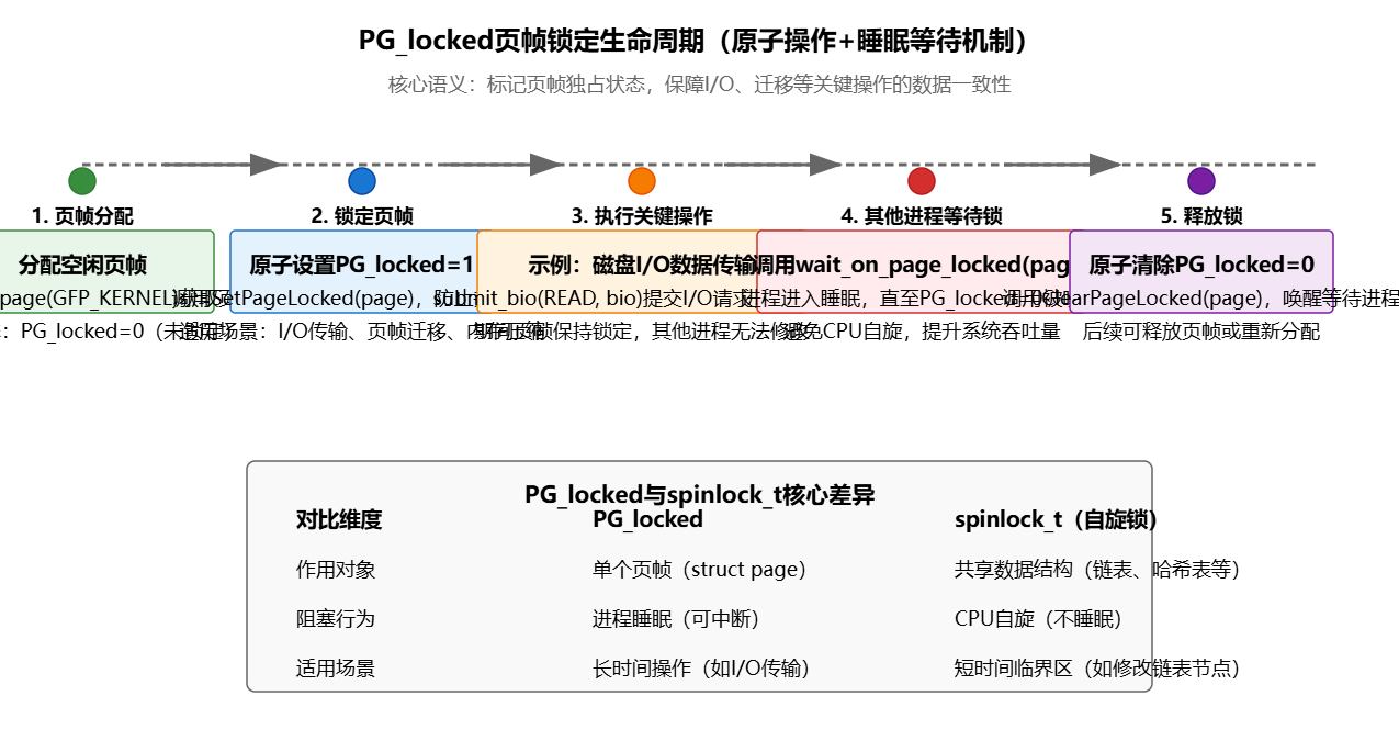 标志用于标记页帧处于“锁定状态”——此时内核的其他部分(如进程、中断处理程序)不允许访问该页帧,直至锁被释放。这种“独占性”是避免页帧在关键操作(如I/O数据传输、内存迁移)中被意外修改的核心保障。