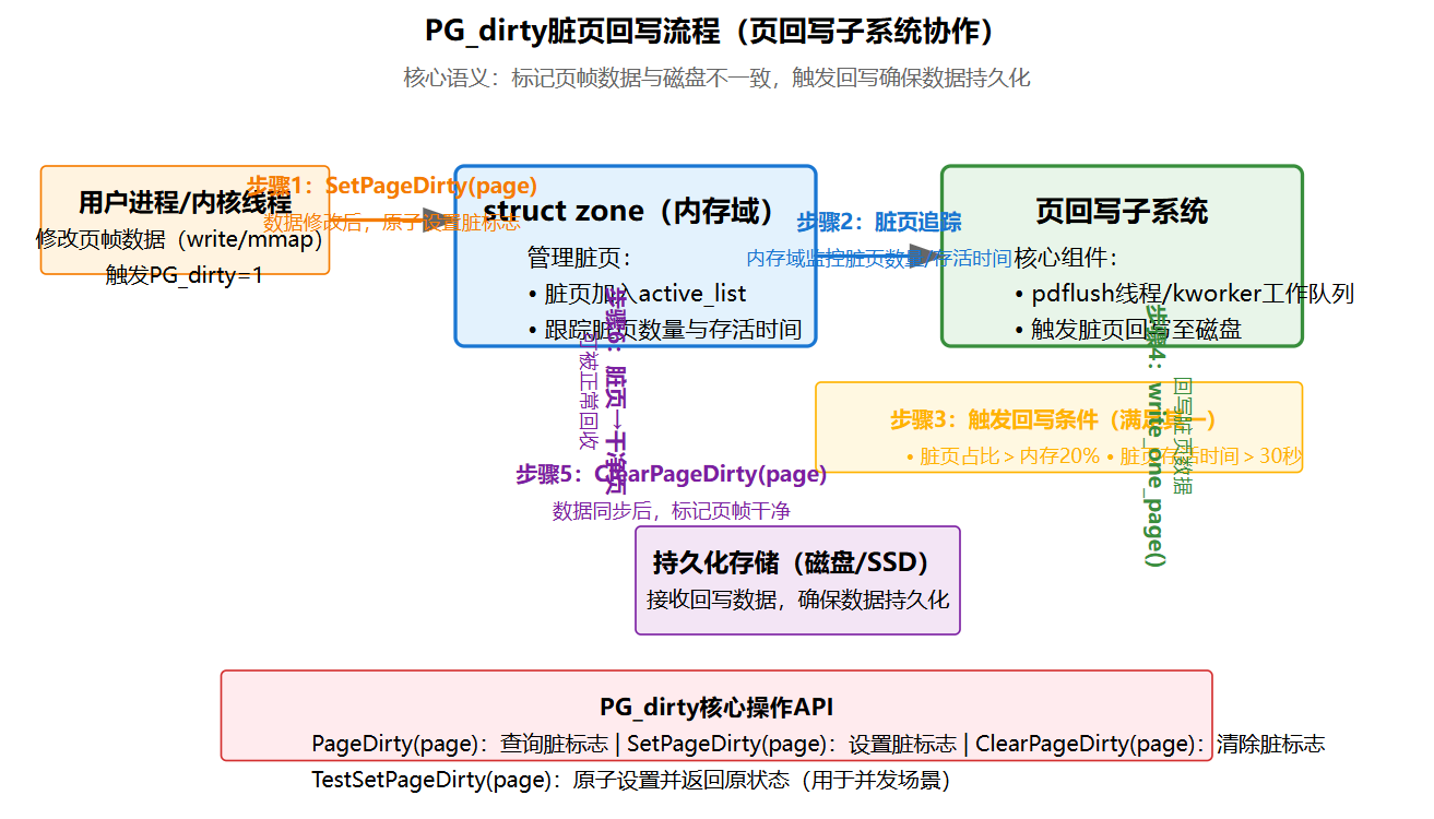 Linux内核通过“页回写子系统”(Page Writeback Subsystem)管理脏页的同步,PG_dirty