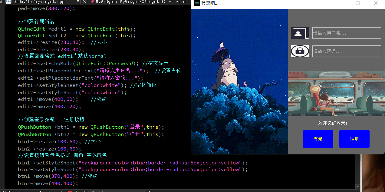 {//首先设置界面大小以及界面美化this->resize(640,480);this->setWindowTitle("登录吧..."); //标题this->setWindowIcon(QIcon("D:\\picture\\logo.png")); //图标this->setStyleSheet("background-color:rgb(100,100,100)"); //背景色this->setFixedSize(640,480); //固定大小//创建一个标签QLabel *lab = new QLabel(this);lab->resize(320,480); //标签大小//设置动态图片QMovie *mv = new QMovie("D:\\picture\\mysearch.gif");lab->setMovie(mv);mv->start();lab->setScaledContents(true); //大小自适应//创建用户名和密码标签QLabel *uname = new QLabel(this);QLabel *pwd = new QLabel(this);uname->resize(60,40); //大小pwd->resize(60,40);//标签设置为图片uname->setPixmap(QPixmap("D:\\picture\\userName.jpg"));pwd->setPixmap(QPixmap("D:\\picture\\passwd.jpg"));uname->setScaledContents(true); //大小自适应pwd->setScaledContents(true);uname->move(330,60); //移动pwd->move(330,120);//创建行编辑器QLineEdit *edit1 = new QLineEdit(this);QLineEdit *edit2 = new QLineEdit(this);edit1->resize(230,40); //大小edit2->resize(230,40);//设置回显格式 edit1为默认Normaledit2->setEchoMode(QLineEdit::Password); //密文显示edit1->setPlaceholderText("请输入用户名..."); //设置占位edit2->setPlaceholderText("请输入密码...");edit1->setStyleSheet("color:white"); //字体颜色edit2->setStyleSheet("color:white");edit1->move(400,60); //移动edit2->move(400,120);//创建登录按钮 注册按钮QPushButton *btn1 = new QPushButton("登录",this);QPushButton *btn2 = new QPushButton("注册",this);btn1->resize(100,60); //大小btn2->resize(100,60);//设置按钮背景色格式 倒角 字体颜色btn1->setStyleSheet("background-color:blue;border-radius:5px;color:yellow");btn2->setStyleSheet("background-color:blue;border-radius:5px;color:yellow");btn1->move(370,400); //移动btn2->move(490,400);//创建标签 用于美化QLabel *lab1 =new QLabel(this);lab1->resize(320,150);QMovie *mv1 = new QMovie("D:\\picture\\mys.gif");lab1->setMovie(mv1);mv1->start();lab1->move(320,205);lab1->setScaledContents(true);QLabel *lab2 = new QLabel(this);lab2->resize(200,35);lab2->setText("欢迎您的登录!");lab2->setStyleSheet("color:white");lab2->move(420,360);