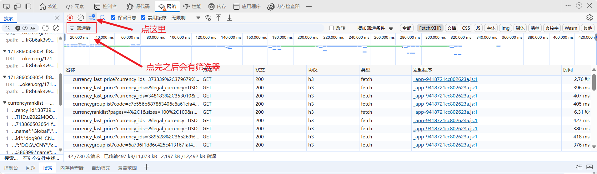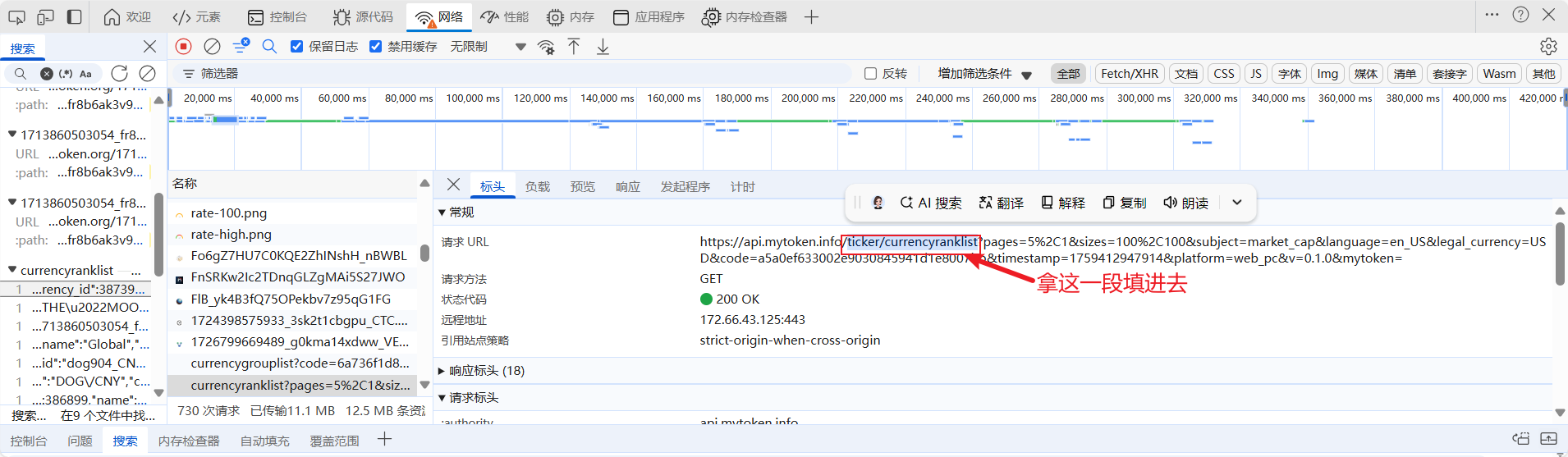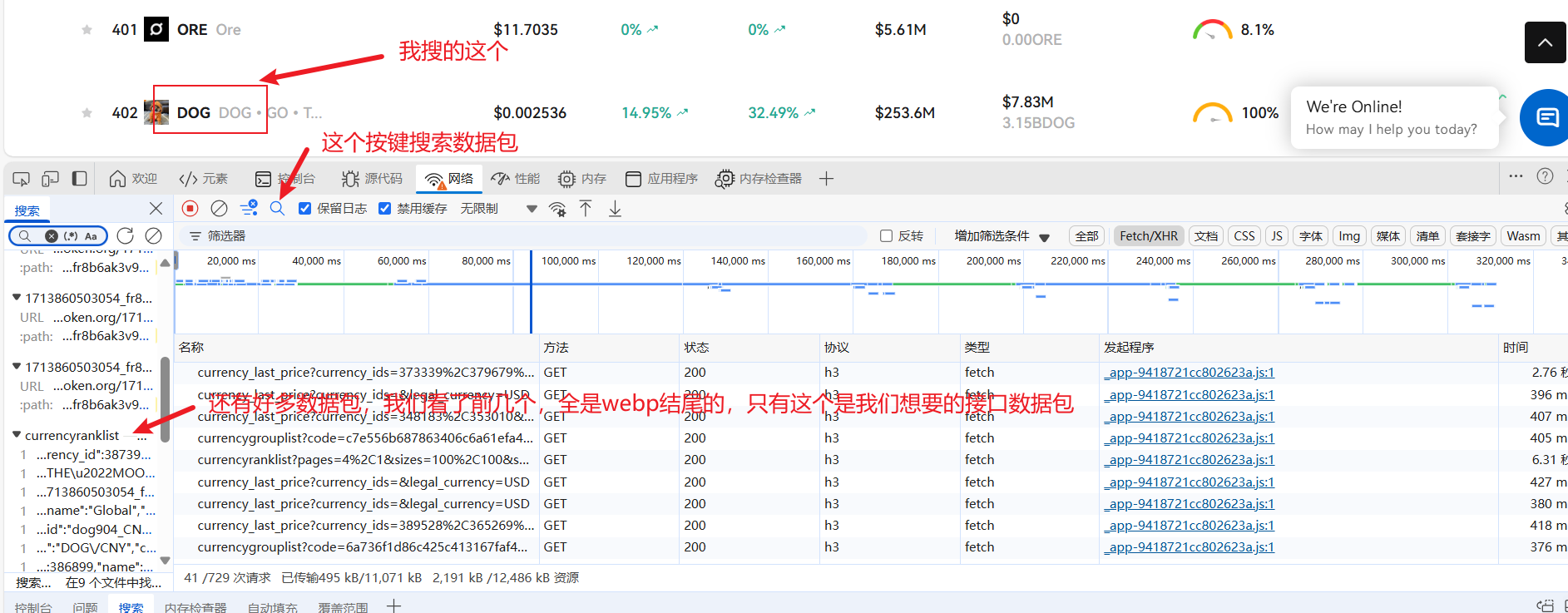 我们进入网站,打开开发者工具,如果发现这个网站数据包很多,可以先把数据包清掉,然后翻页触发接口,但是你会发现还有好多数据包啊,这时我们搜索页面上的数据来找数据包:webp结尾都是图片,找到数据包之后我们可以筛选数据包: