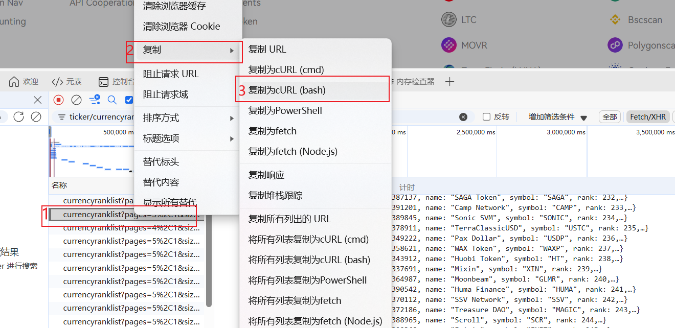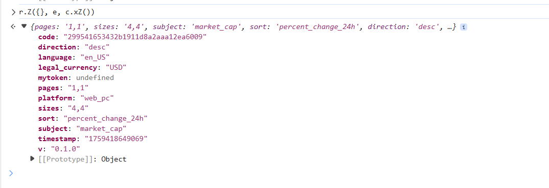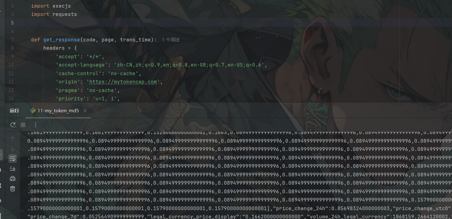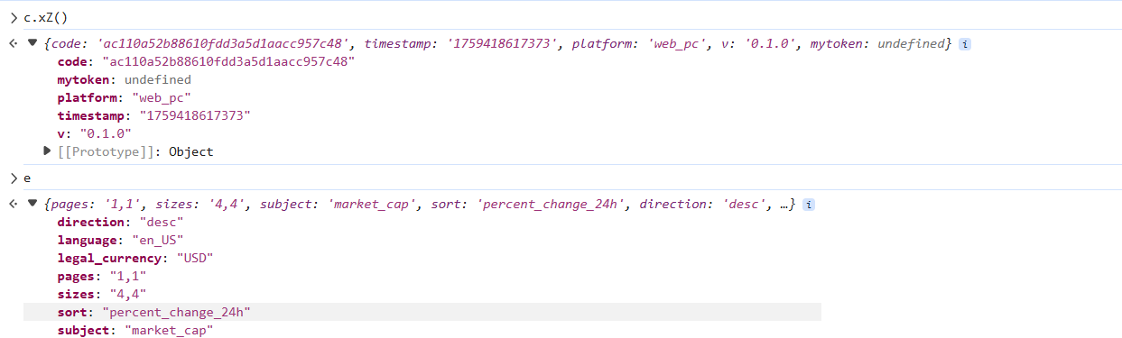 import requestsdef get_response(code, page, trans_time):headers = {'accept': '*/*','accept-language': 'zh-CN,zh;q=0.9,en;q=0.8,en-GB;q=0.7,en-US;q=0.6','cache-control': 'no-cache','origin': 'https://mytokencap.com','pragma': 'no-cache','priority': 'u=1, i','referer': 'https://mytokencap.com/','sec-ch-ua': '"Chromium";v="140", "Not=A?Brand";v="24", "Microsoft Edge";v="140"','sec-ch-ua-mobile': '?0','sec-ch-ua-platform': '"Windows"','sec-fetch-dest': 'empty','sec-fetch-mode': 'cors','sec-fetch-site': 'cross-site', # ua自己写一下}params = {'pages': f'{page},1','sizes': '100,100','subject': 'market_cap','language': 'en_US','legal_currency': 'USD','code': code,'timestamp': trans_time,'platform': 'web_pc','v': '0.1.0','mytoken': '',}return requests.get('https://api.mytoken.info/ticker/currencyranklist', params=params, headers=headers).textclass JSExecutor:def __init__(self, js_file_path):if not os.path.isfile(js_file_path):raise FileNotFoundError(js_file_path)with open(js_file_path, 'r') as f:self.js_code = f.read()self.js_code = execjs.compile(self.js_code)def call(self, func_name, *args):return self.js_code.call(func_name, *args)if __name__ == '__main__':js_executor = JSExecutor('11-my_token_md5.js')for get_page in range(1, 5):get_time = str(int(round(time.time() * 1000)))params_code = js_executor.call('get_md5', f'{get_time}')print(params_code, type(params_code))print(get_response(params_code, get_page, get_time))