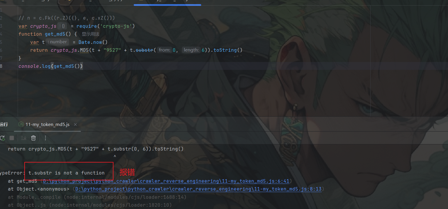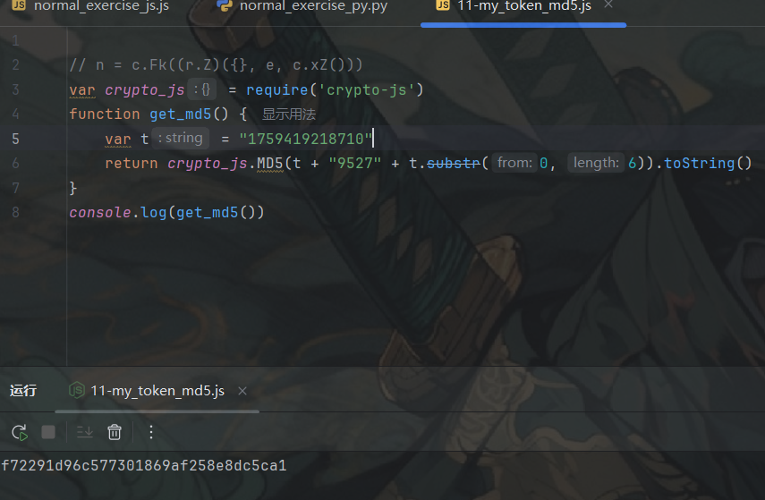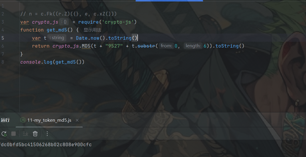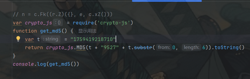function get_md5() {var t = Date.now()return crypto_js.MD5(t + "9527" + t.substr(0, 6)).toString()